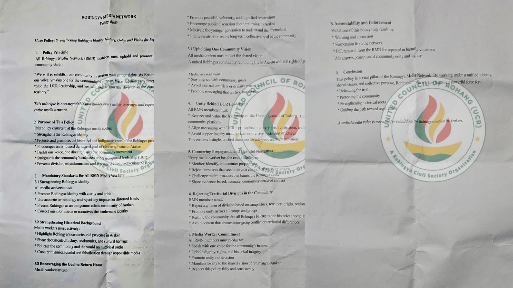 The “Rohingya Media Network (RMN) Policy draft” pretends to be a foundational document for community cohesion, yet it is, in reality, a blueprint for centralised narrative control. Far from establishing a true network of photographers, journalists and content creators, this document demands absolute loyalty to the United Council of Rohang (UCR),