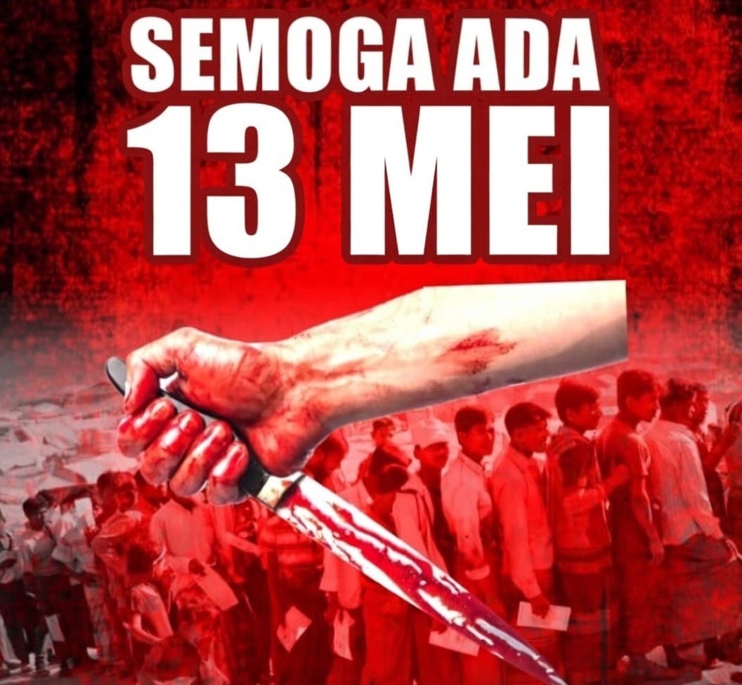 Last week, a graphic began circulating in a Malaysian Facebook space that targets PATI - Pendatang Asing Tanpa Izin (“foreigners without permits”). The image was bluntly incendiary - a bloodied knife held in a fist, overlaid with the words “SEMOGA ADA 13 MEI” - “Hopefully there will be a 13 May.”