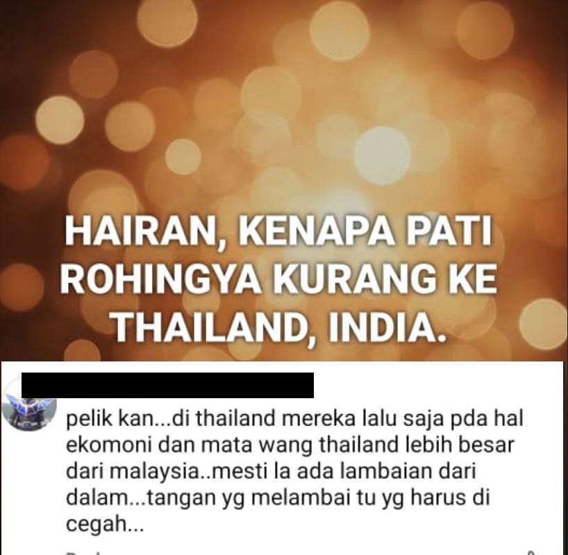 A friend of mine in Penang did a simple search - “Rohingya Malaysia” - and landed on a set of public posts and groups where the tone is not about “concern” or “policy debate,” but contempt. Rohingya are framed as illegal, dirty, criminal, culturally incompatible, and fundamentally undeserving.