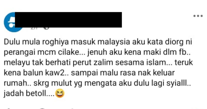 One post, written in colloquial Malay, recalls that the author used to insult Rohingya online, got criticised for it, and now feels vindicated - “the same mouths who abused me before… deserve it.” This is not a policy position. It is social permission - the emotional reward of contempt, the pleasure of being “right” about a stigmatised group.