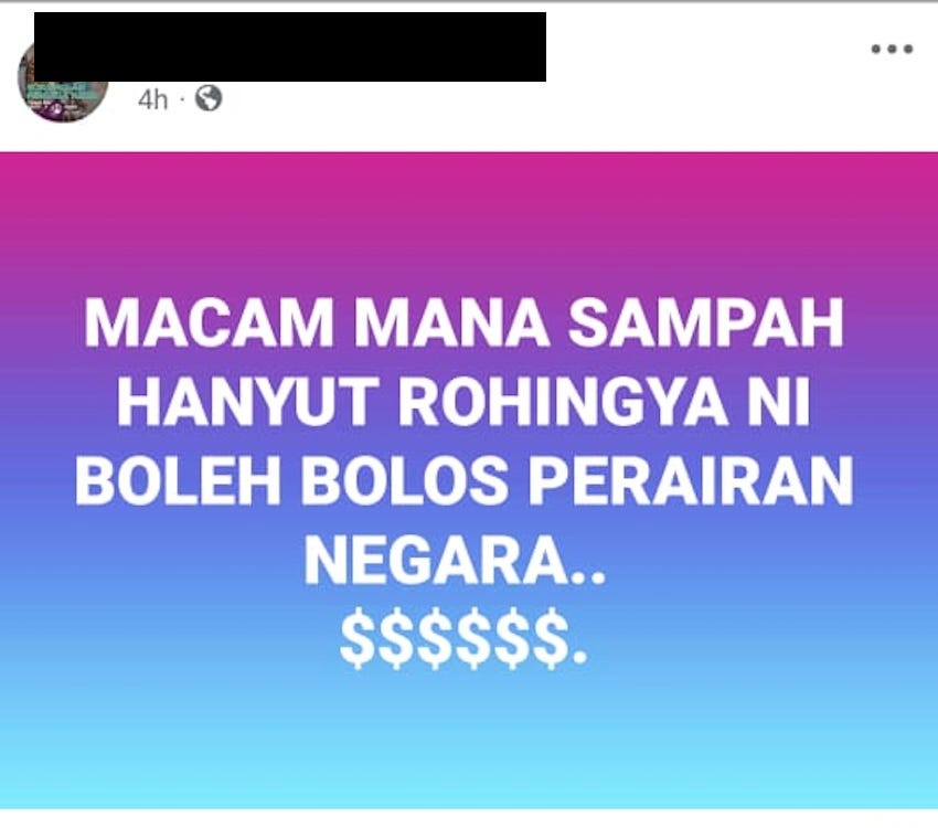 The phrase used - sampah hanyut - is dehumanising. It renders human beings as trash. The “$” implies bribery. Someone must have been paid to let them through. Hate is made “reasonable” by dressing it up as anti-corruption suspicion.