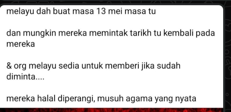 “13 May” is not a neutral date in Malaysia. It is shorthand for the 1969 racial riots, a symbol of mass violence. And the caption attached to the image did not soften the meaning. It praised past violence, implied it should happen again, and described an unnamed target as “halal diperangi” — religiously permissible to be fought — “enemies of religion.”