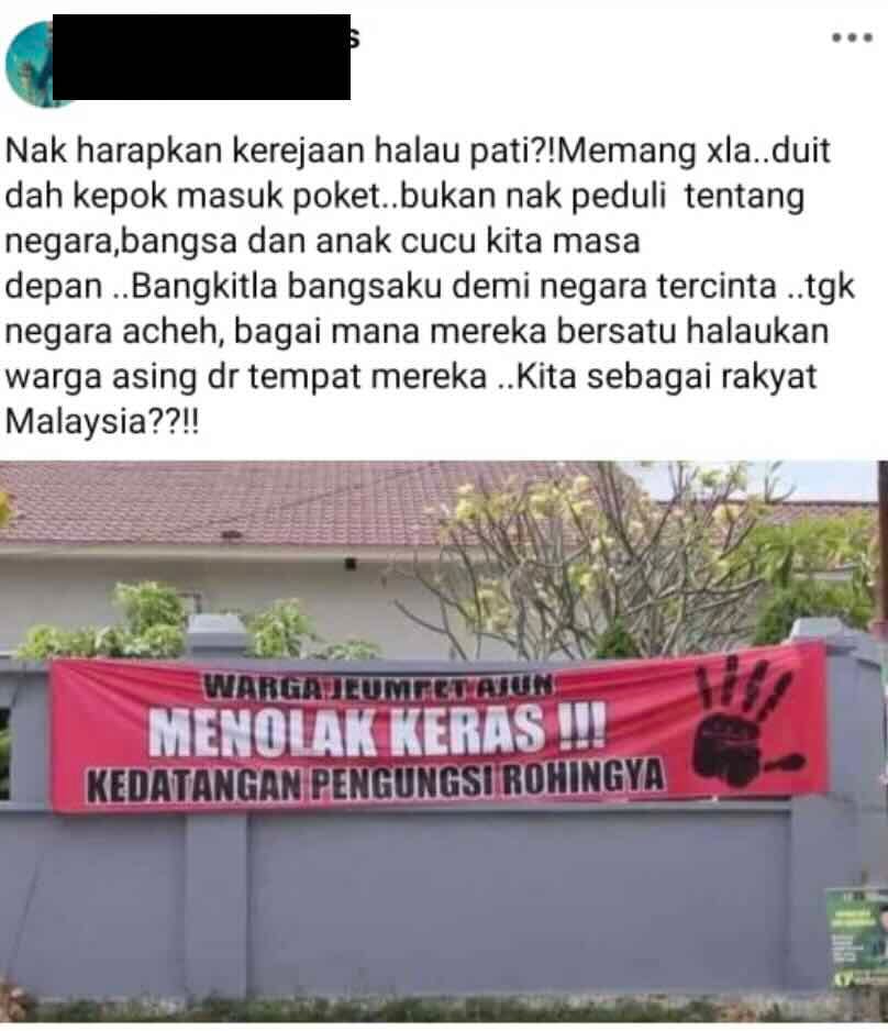 A banner in the same post says: “Strongly reject the arrival of Rohingya refugees.”