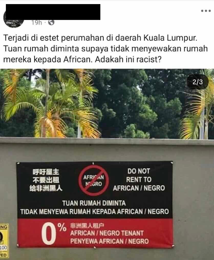 One of the posts I saw wasn’t about Rohingya at all. It showed a banner in a Kuala Lumpur housing estate reading: “DO NOT RENT TO AFRICAN / NEGRO” and “0% African tenant,” in multiple languages.